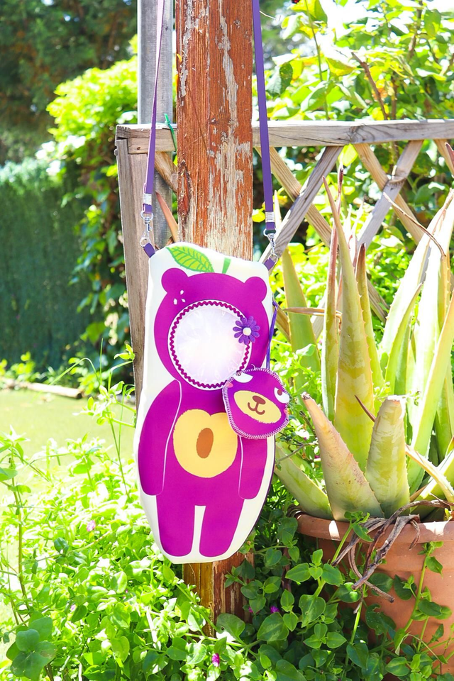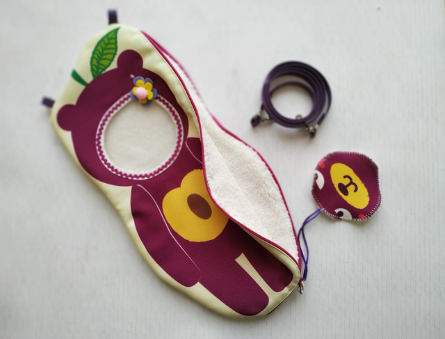 Each bag is made of high quality double-sided printed canvas fabric and it is waterproof. On the front side, there is the design of the Frutoso bear with a transparent window on top where you can see the head of you doll. On the back side, there is the whole Frutoso design. Inside this Frutoso doll carrier is lined with a very soft and cozy fabric.