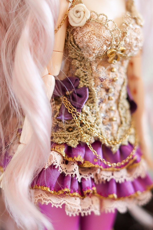 Corset dress closed in back with eyelets, adjustable. Ornamented with handsewn golden lace, chains and little lilac bows